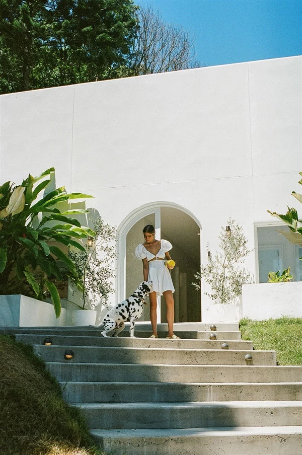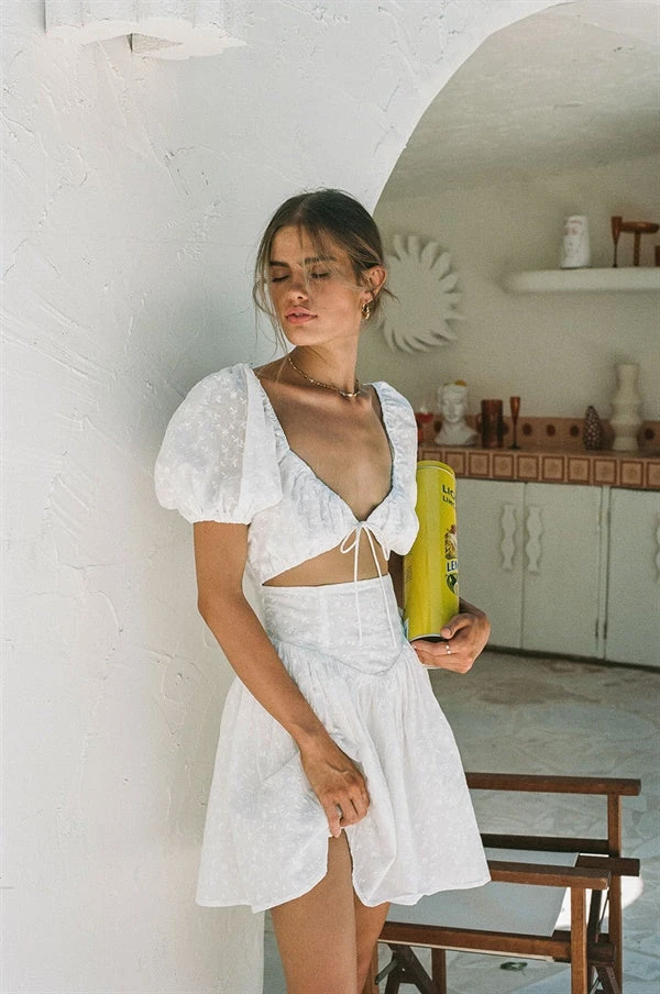 Straight from our ‘The Artist’ collection, the Alika Dress is made from a natural embroidered cotton fabric in an off white hue. It features short puff sleeves, tie at centre bust, cutout at waist, fitted corset waist and flouncy skirt. Style with the Strappy Lilly Heels and Celestial Hoop Earrings for your next night out! Designed exclusively by Sabo.
