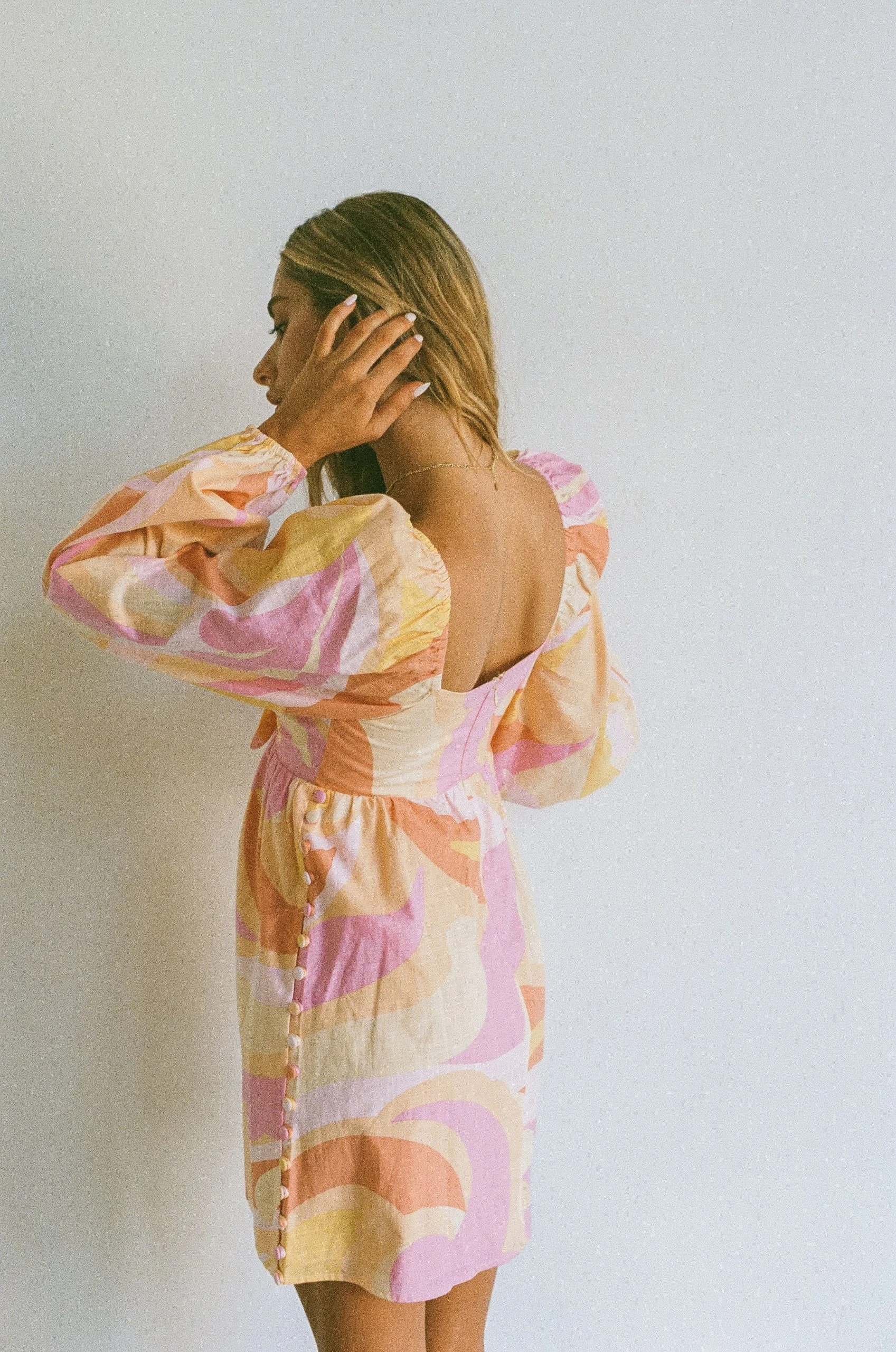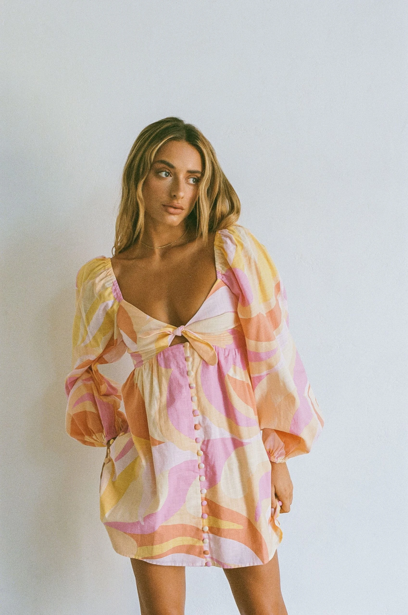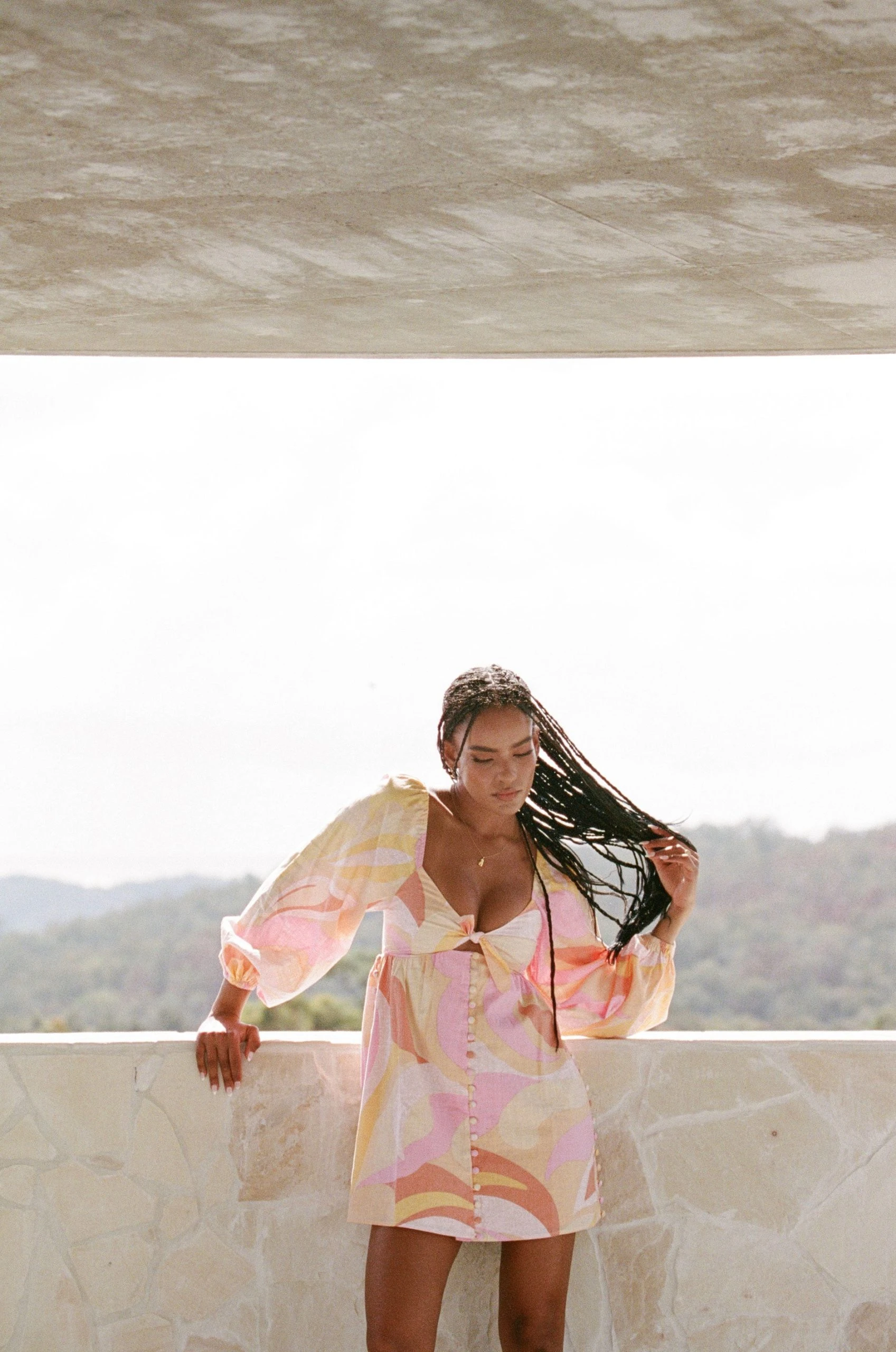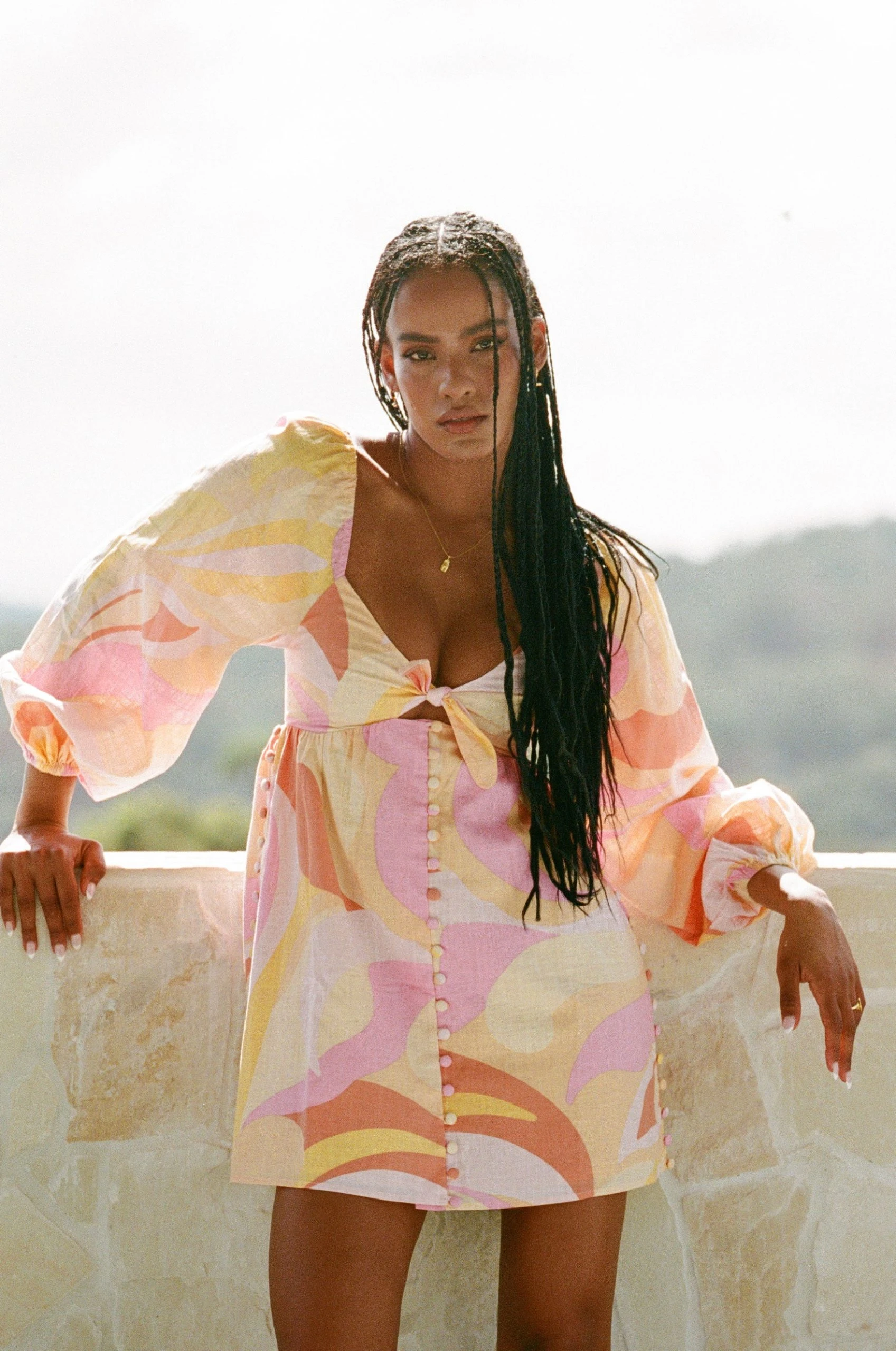 We’ve got your party season sorted! The Alya Babydoll Dress is made from a high quality natural cotton fabric with our exclusive Lucid Fuego print. It is a babydoll style featuring full length puff sleeves, cutout at tie at centre bust and button detailing at centre and sides of skirt. Pair with the Strappy Asteria Heels and Milli Link Earrings for your next event! Designed exclusively by Sabo.