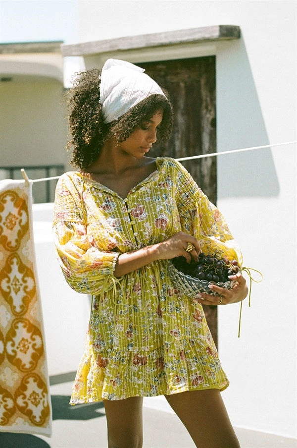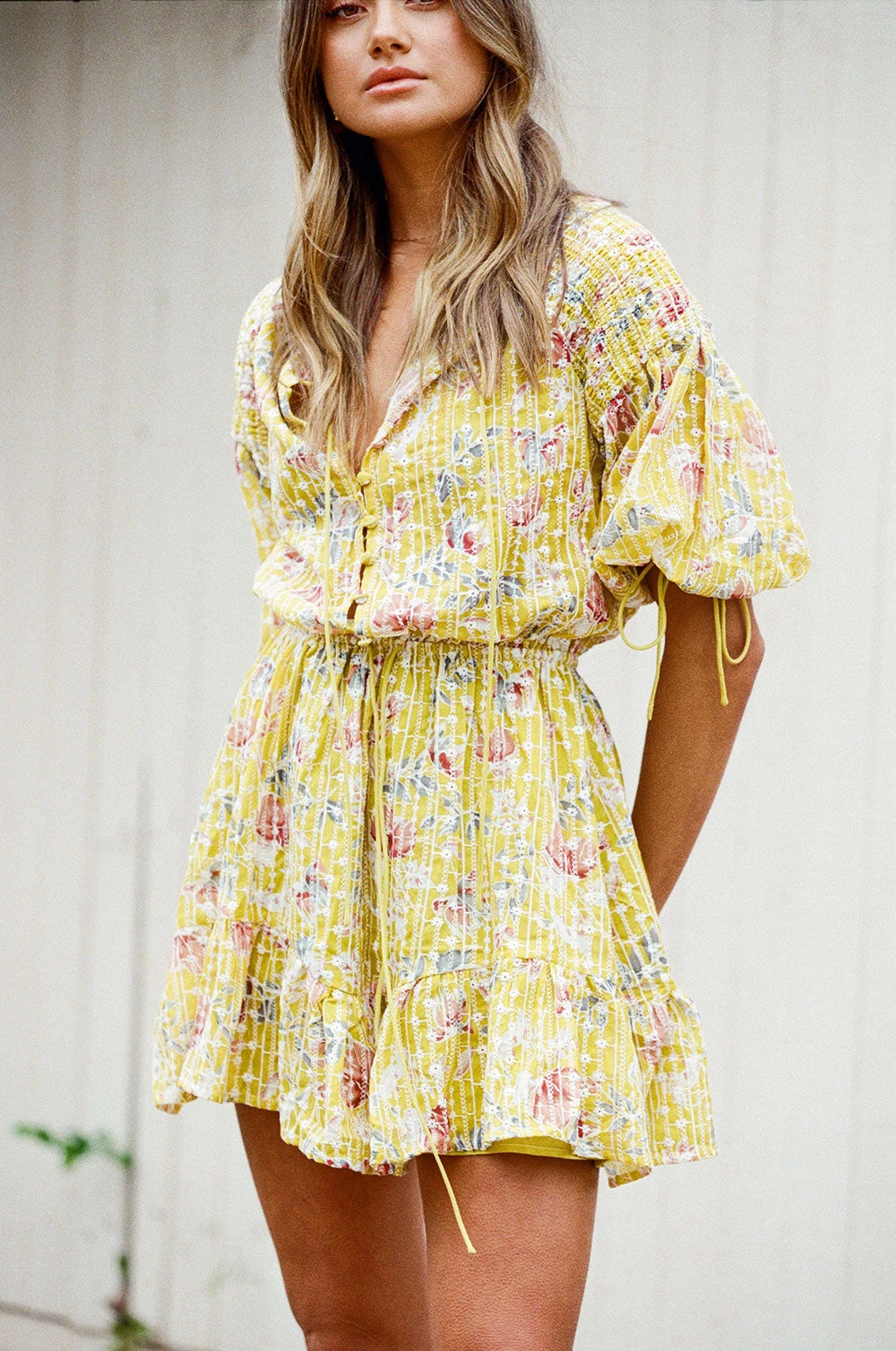The perfect piece for your next event! The Anouk Dress is made from a mustard floral fabric with contrast embroidery throughout. It features covered buttons at centre front, tie at neck, shirred detailing at shoulders, short puff sleeves with ties, elasticated waist with drawstring and a flouncy twin tiered skirt. Dress it up with the Rico Handle Bag and Strappy Rafaela Heels! Designed exclusively by Sabo.