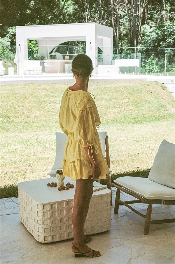 Dress it up with heels or keep it casual with sneakers! The Anouk Dress is made from a high quality natural linen blend fabric in a vibrant yellow hue. It features covered buttons at centre front, tie at neck, shirred detailing at shoulders, short puff sleeves with ties, elasticated waist with drawstring and a flouncy twin tiered skirt. Accessorise with the Rico Handle Bag and Strappy Lilly Heels for your next event! Exclusively designed by Sabo.