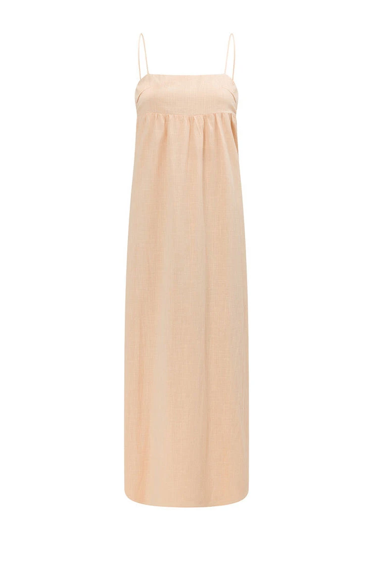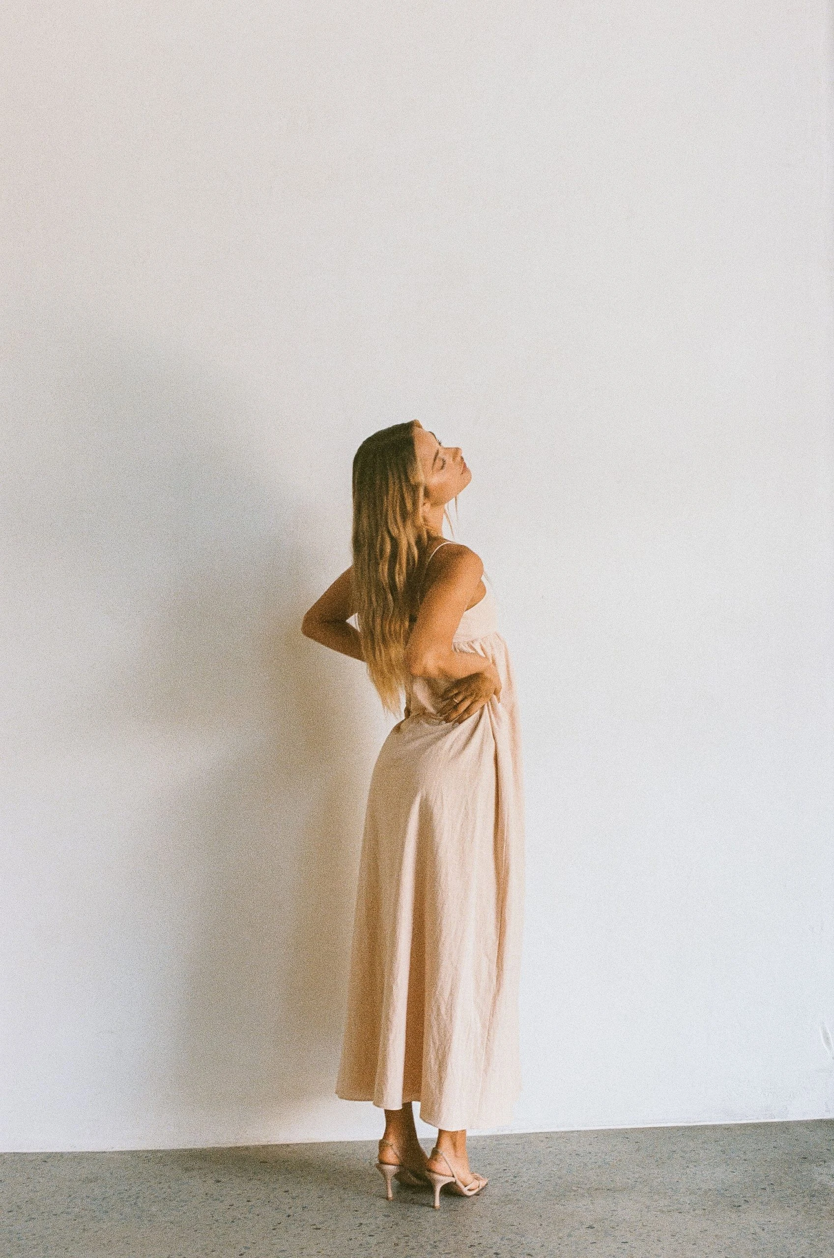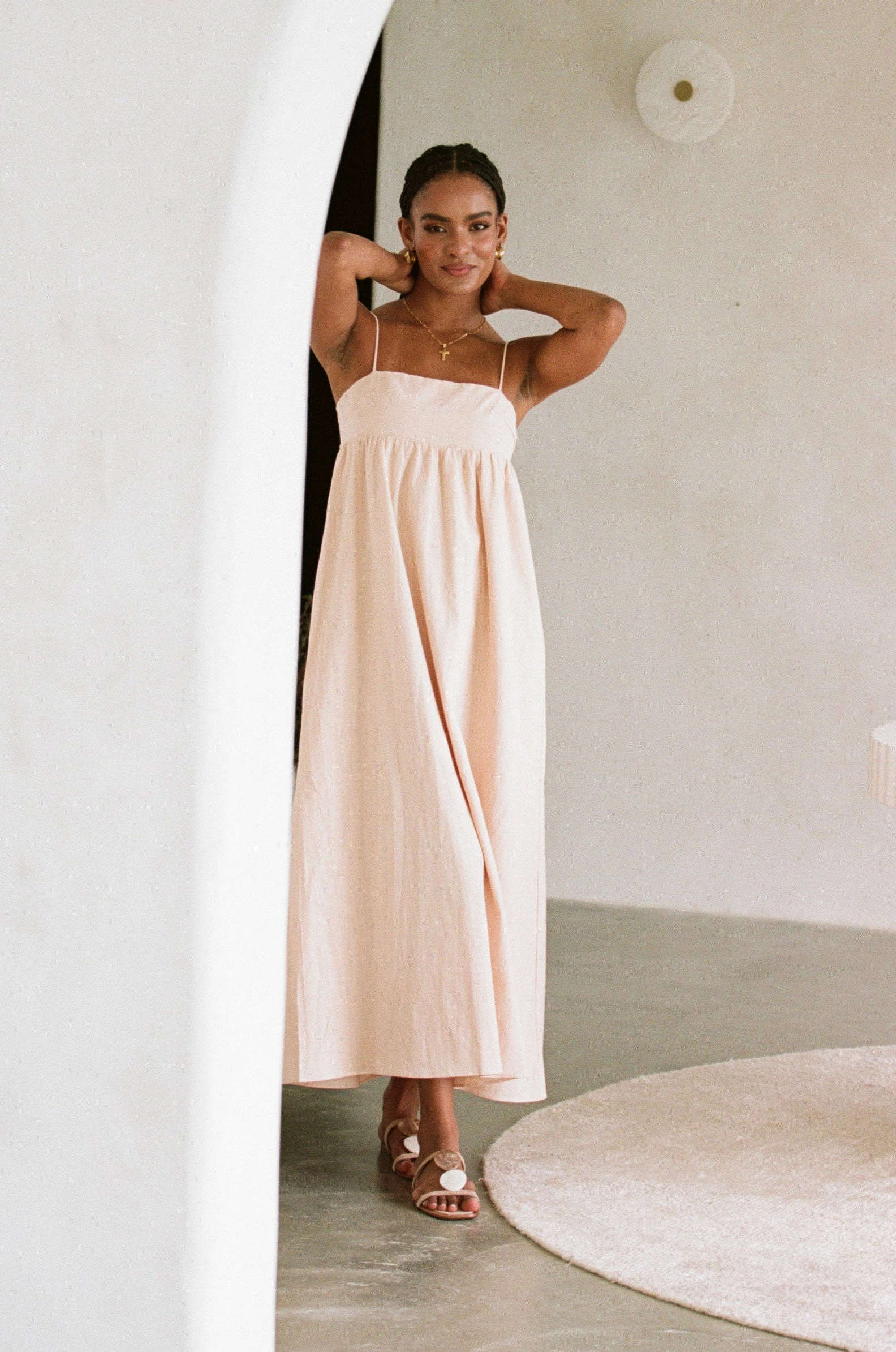 Throw it on for instant style! The easy-to-wear Azaria Dress is made from a structured natural cotton fabric in a sandy beige hue. It features thin rouleau straps, straight neckline, fitted bust and flowy ankle grazing skirt. Style with slides and the Matisse Sunglasses! Designed exclusively by Sabo.