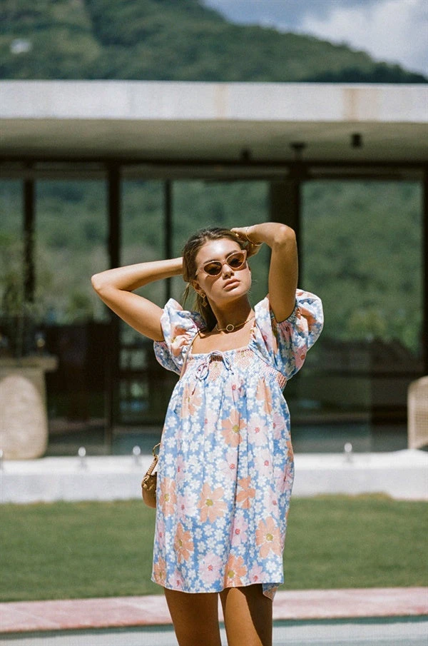 Drop 1 of our brand new Her Haven collection coming in hot! The Bambina Dress is made from a high quality linen cotton blend fabric with our exclusive Sky Floral print. It is a babydoll style featuring short puff sleeves, shirred panel across neckline and tie at centre front. Get the look with the Kumi Bag and Tondara Hoop Earrings! Exclusively designed by Sabo.