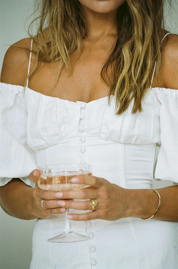 Step out in style with the Blanca Dress, made from a high quality linen blend fabric in white. It features off shoulder puff sleeves, thin straps, covered buttons down centre front and a boned corset waist. Pair with heels and gold accessories for a night out! Designed exclusively by Sabo.