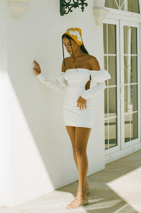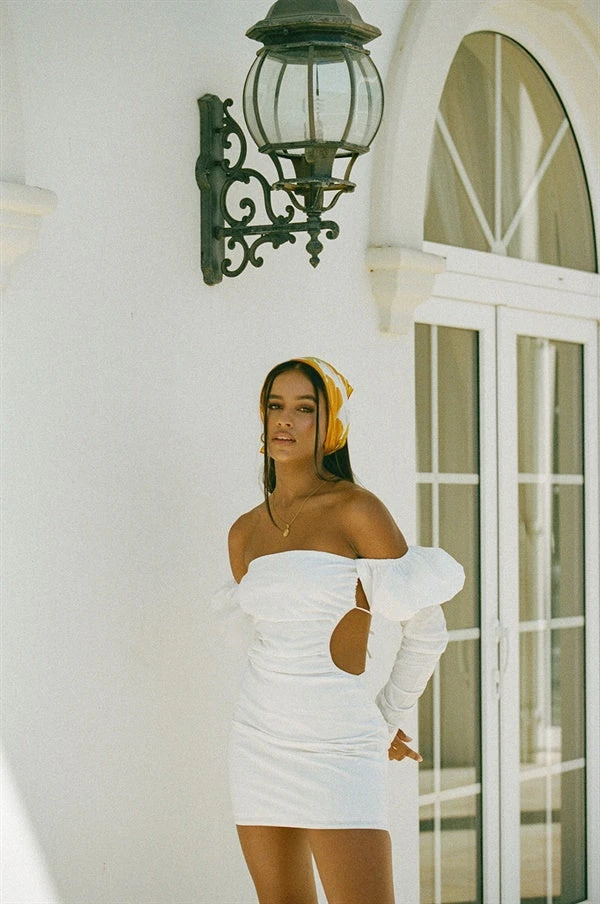 For the fashion forward lovers of structure! The Cemarra Cutout Dress is made from a high quality natural linen cotton blend fabric in an off white hue. It is a backless style featuring full length gathered sleeves with puff detailing, straight neckline, cutouts at sides of waist and ties at back. Complete the look with the T Bar Link Necklace and Luna Twirl Earrings for your next event! Designed exclusively by Sabo.