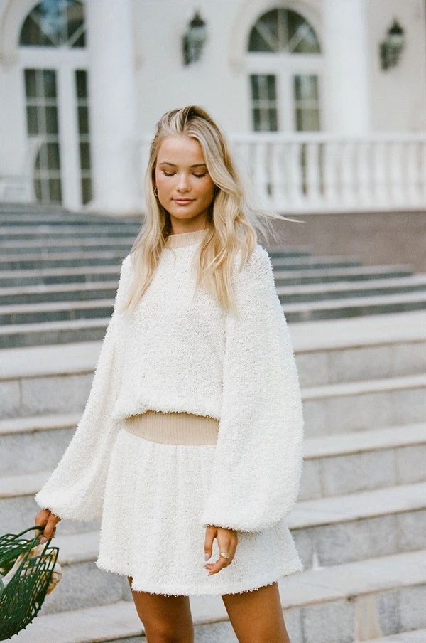 *THIS IS A FINAL SALE ITEM* Add some texture to your wardrobe with the Fluffy Liza Dress, made from a fluffy knit in a cream hue. It is a relaxed style featuring tan ribbed detailing at neckline, cuffs and waist, full length puff sleeves and a flouncy skirt. Complete the look with the Artique Basket Bag and Kamala Earrings! Exclusively designed by Sabo.