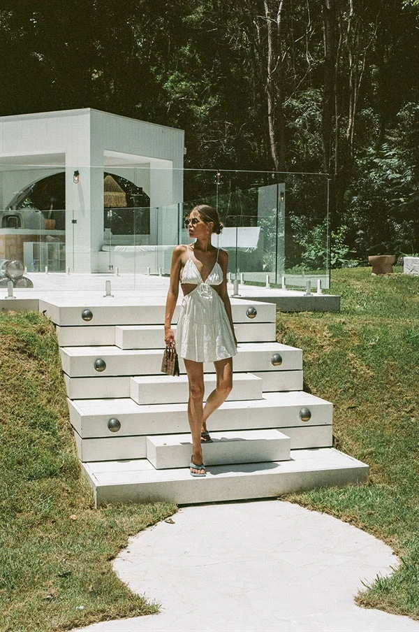Inspired by summer and designed to flatter! The Isabella Dress is made from a stunning raw feel viscose linen blend fabric in a light cream hue. It is a backless style featuring tri cups, cutout at waist and floaty skirt. Dress it up with heels or keep it casual with flat strappy sandals or sneakers. Designed exclusively by Sabo.