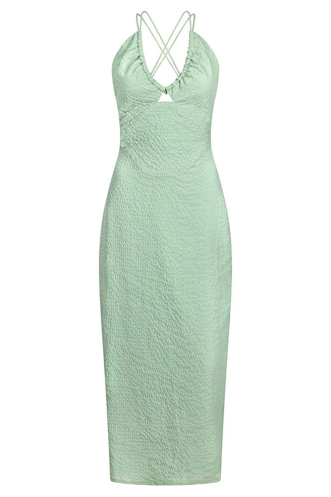 The Kamila Dress is made from the most stunning bubble textured fabric in a sea foam hue! It is a midi style featuring an adjustable curved neckline with strappy halter detailing and centre back split. Style with the green Strappy Zita Sandals! Designed exclusively by Sabo.
