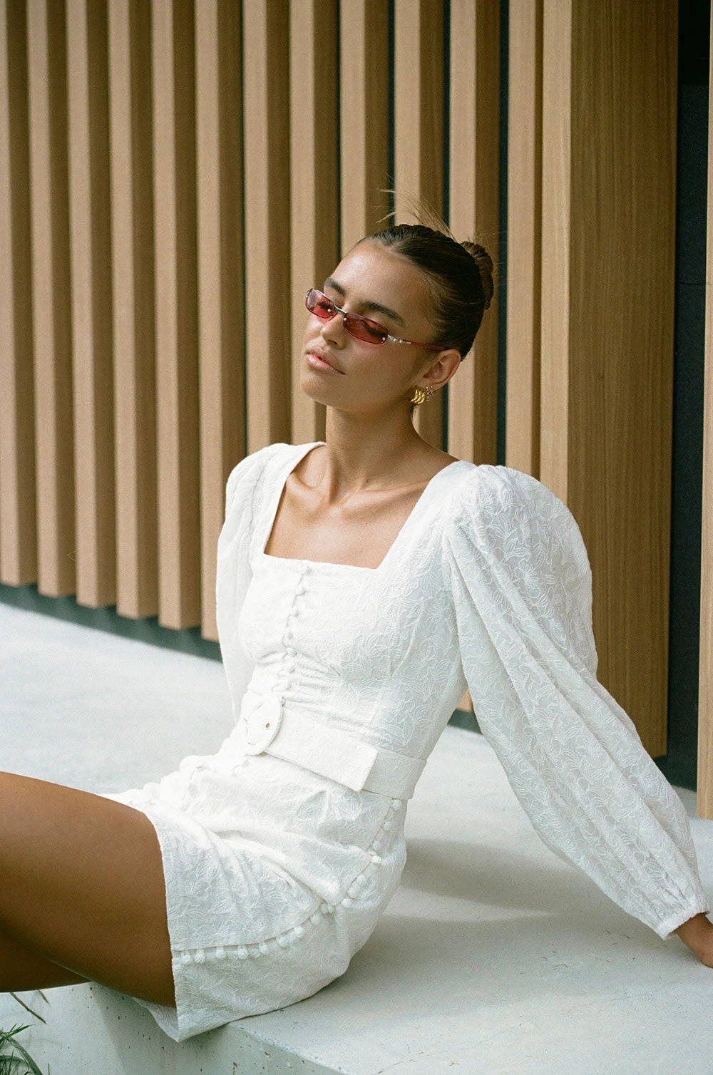 A classy style in the most stunning structured fabric! The Kita Dress is made from an embroidered voile fabric in white. It features a square neckline, long puff sleeves, covered button detailing down sides and centre front and a matching belt. Pair with the Strappy Lilly Heels and Celestial Hoop Earrings for your next event! Designed exclusively by Sabo.