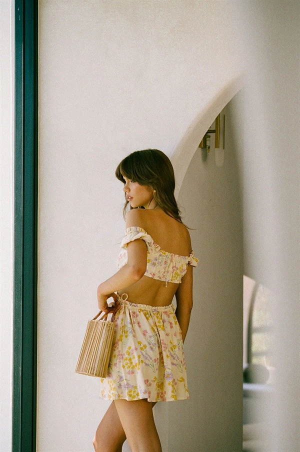 Straight from our That French Song collection, the Lashara Crepe Dress is made from a stunning zipper crepe fabric in a soft yellow hue. It features our exclusive hand painted spring floral print, cap sleeves, ruffle trim detailing, draw elastic neckline with tie at centre, cutouts and ties at waist and a flouncy skirt. Can be work on off shoulder! Designed exclusively by Sabo.