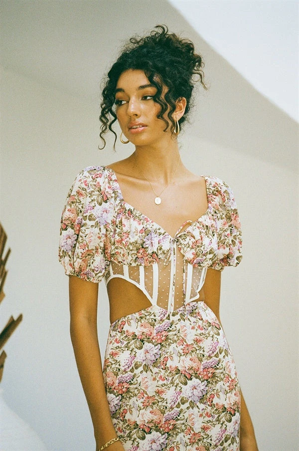 The dreamy Leah Corset Maxi is made from a lightweight chiffon-feel fabric with a floral print. It is a maxi style featuring short puff sleeves, elasticated neckline with tie at centre bust, gathered cups, a sheer boned corset detail and cutout at waist. The perfect outfit for your next event! Designed exclusively by Sabo.