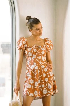 Wear it to lunch or date night! The Lissia Dress is made from a raw natural tan cotton fabric with our exclusive Bloom Floral print throughout. It features short puff sleeves, an elasticated neckline with draw tie detailing and a fitted waist. Pair with the Strappy Juleah Heels and Twist Isa Hoops! Designed exclusively by Sabo.