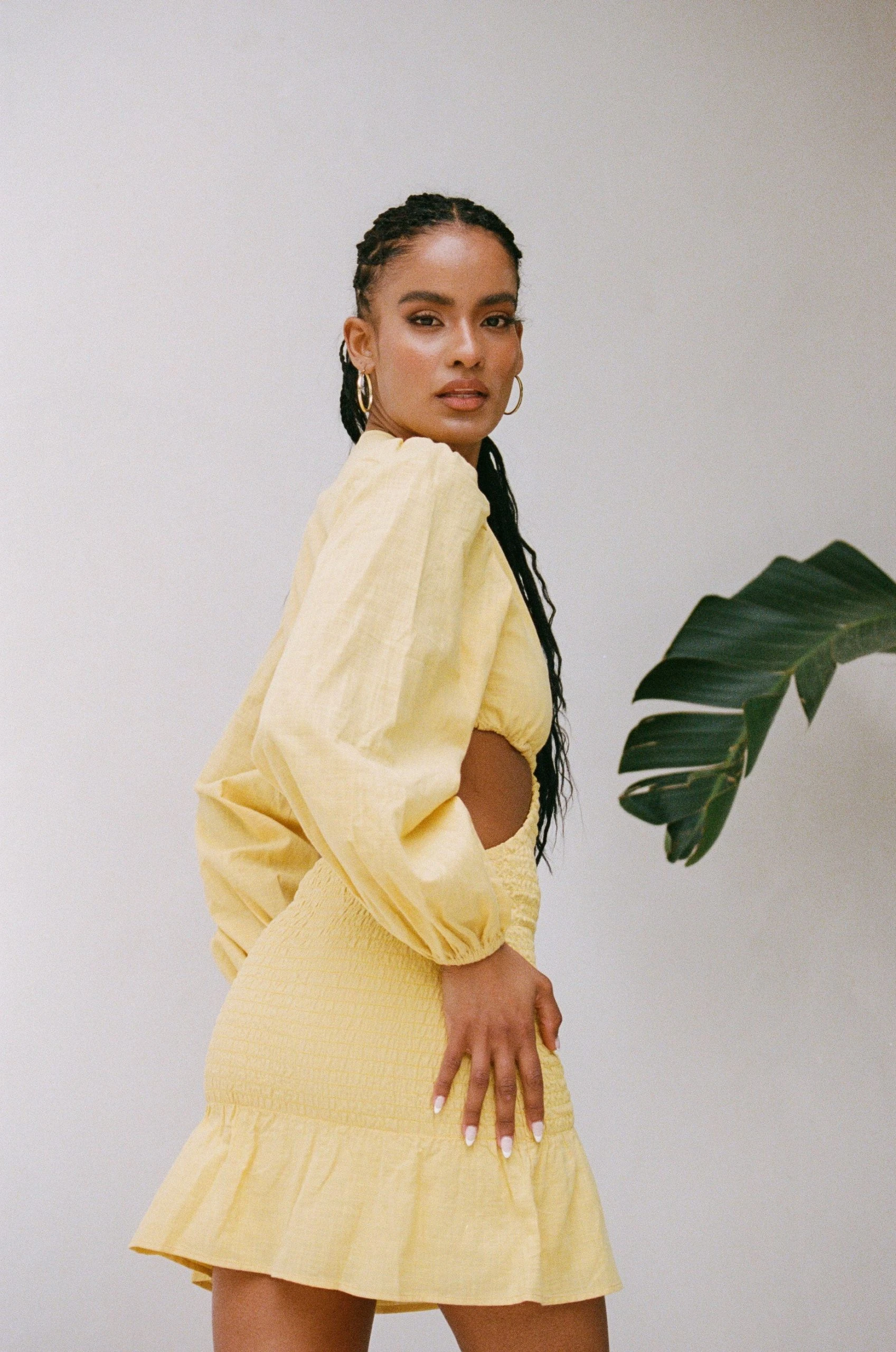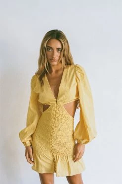 Stand out in our flirty Luda Cutout Dress, made from a structured natural cotton fabric in a yellow hue. It features full length billowing sleeves, plunging V neckline, shirred body, covered buttons down centre front and a frill across hem. Dress it up with the Jamilla Bag and Strappy Rafaela Heels! Designed exclusively by Sabo.