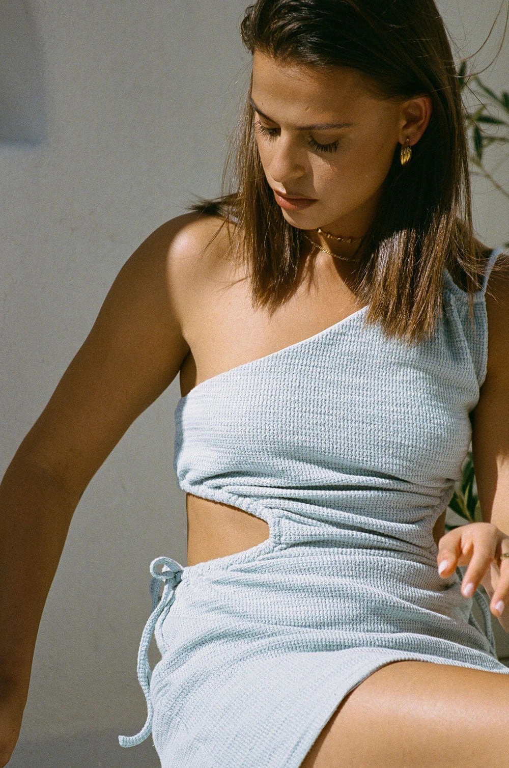 Made from a light knit cotton blend fabric in a light blue hue, the Melanie Dress features cutouts at waist with draw tie details and twin straps at shoulder. Style your look with the Zita Strappy Sandals and Marquee Earrings! Designed exclusively by Sabo.