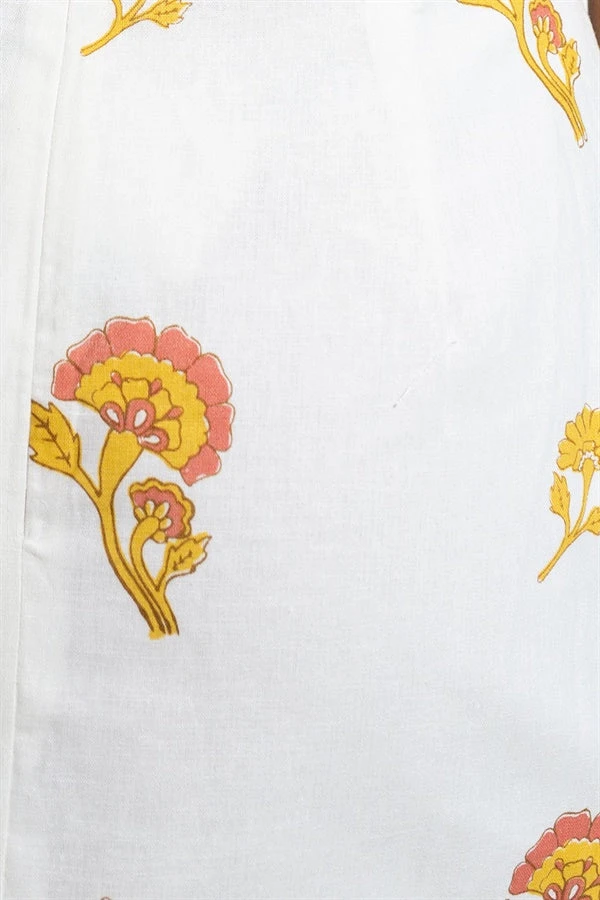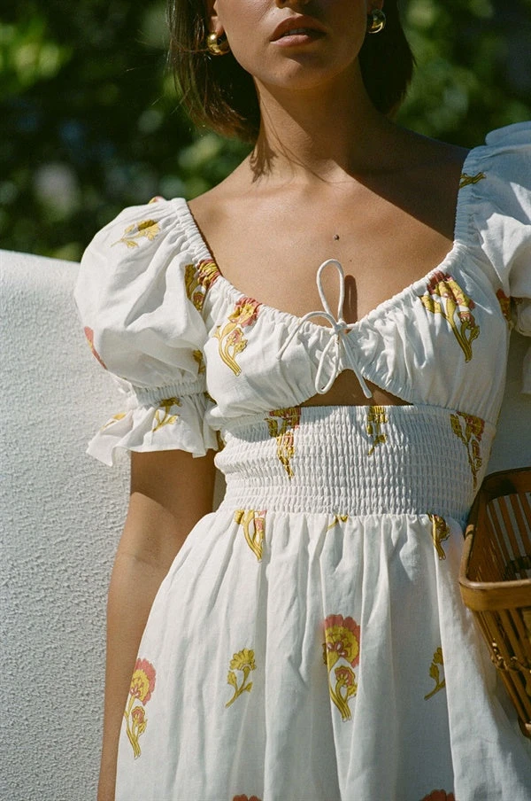 The super flattering Moxxi Dress is made from a high quality linen cotton blend fabric with our exclusive sunset emblem floral print throughout. It features short puff sleeves with ruffle cuffs, draw tie at centre bust, cutout at waist, shirred waist and flouncy skirt. Style your look with the Net Bucket Bag and Gold Cross Necklace! Exclusively designed by Sabo.