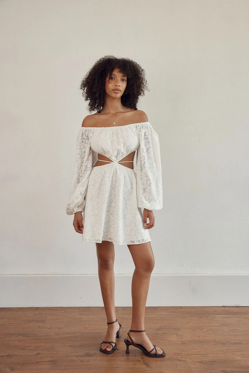 Perfect for a bridal shower, the Naiya Off Shoulder Dress is made from a natural cotton jacquard gauze fabric in white. It features long puff sleeves, cutouts at waist with tie detail and a flouncy skirt. Dress it up with heels and gold accessories! Designed exclusively by Sabo.