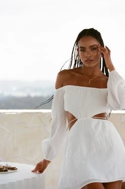 A LWD perfect to style your own way! The Piper Dress is made from a lightweight crepe fabric in white. It is an off shoulder style featuring full length puff sleeves, cutouts at waist with tie detail and a flouncy skirt. Pair with the Zita Strappy Sandals and Tiana Bag! Designed exclusively by Sabo.
