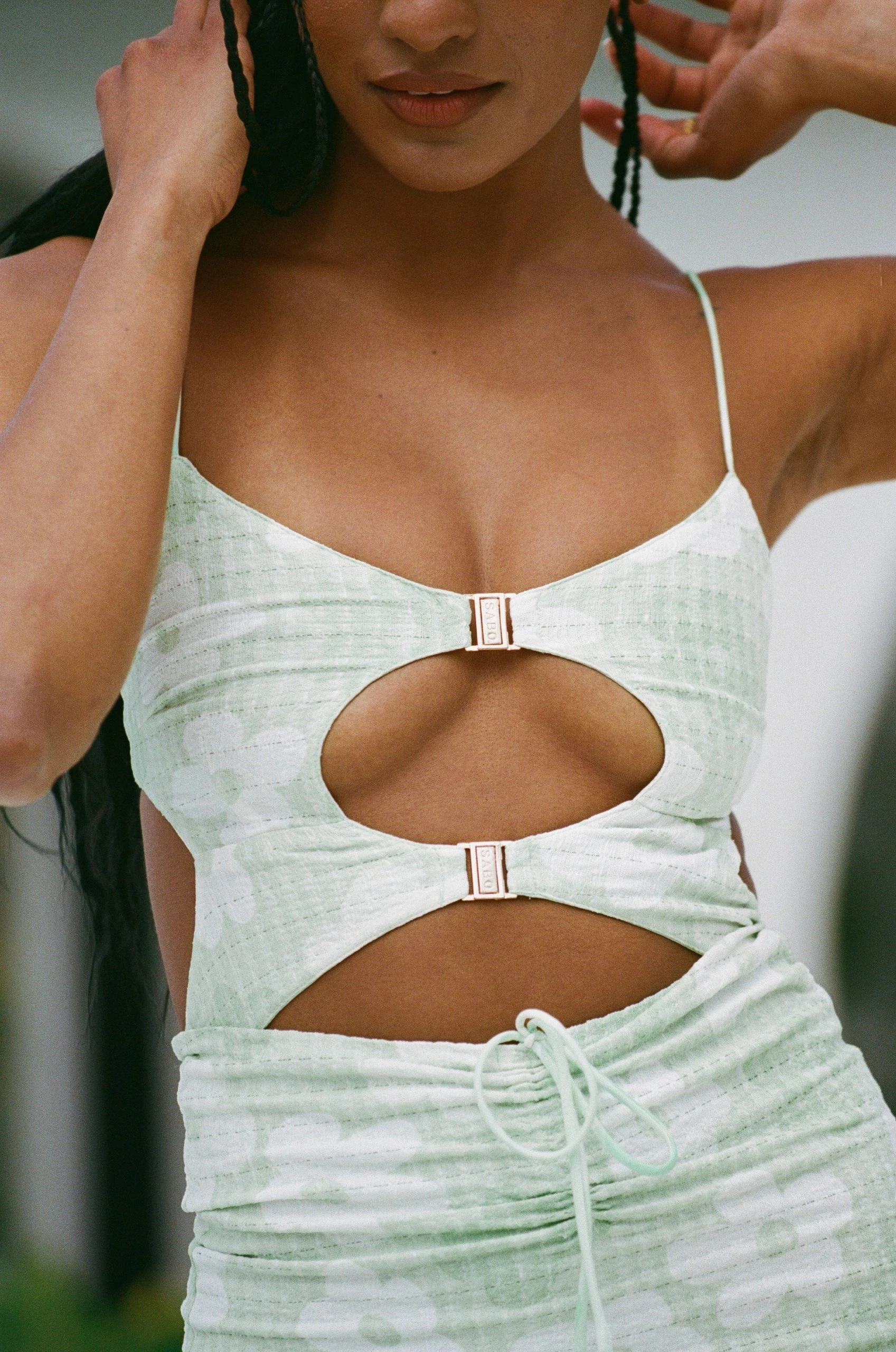 Introducing our After Sunrise collection with the Prae Cutout Dress, featuring our new exclusive Happy Daisy print! It is a fitted mini style with thin rouleau straps, cutouts at waist, gold clip closure details at front and draw detail at centre waist of skirt. Just add slides for the perfect weekend outfit! Designed exclusively by Sabo.