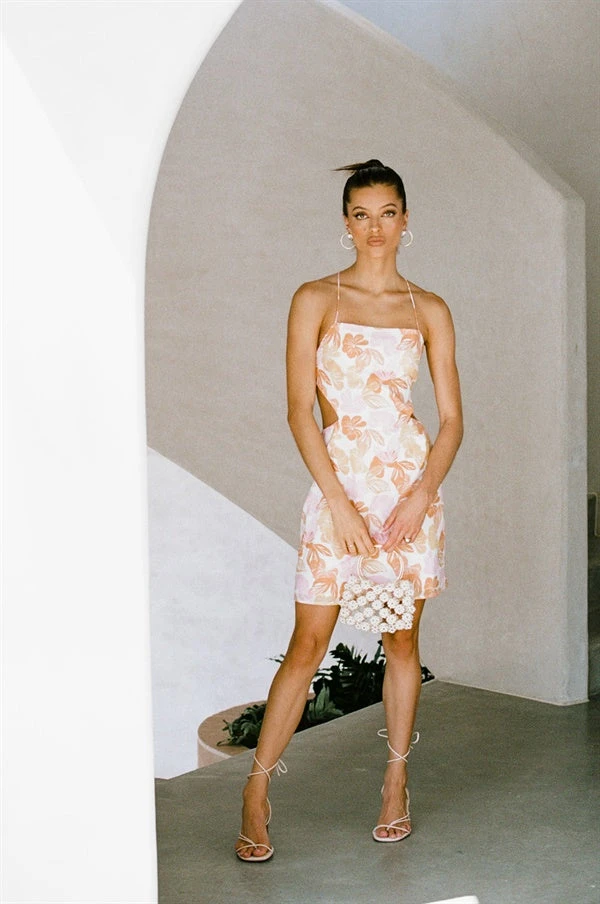 Inspired by sun drenched vacations, the Rae Dress is made from a natural cotton voile fabric with our exclusive Leaf Floral print. It is a backless style featuring stunning strappy detailing, a straight neckline, cutouts at waist and a fitted skirt. Style with the Strappy Rafaela Heels and Glow Necklace for your next night out! Designed exclusively by Sabo.