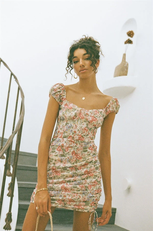 The perfect summer dress! The Rico Dress is made from a lightweight floral fabric and features puff cap sleeves, a boned corset style bodice and a gathered skirt with drawstring sides. Dress it up with heels for the perfect date night outfit! Designed exclusively by Sabo.