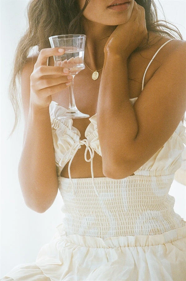 Designed to flatter, the Sambi Dress is made from a high quality natural linen cotton blend fabric in cream with our exclusive line print throughout. It features frill detailing across neckline, ruched cups with elasticated draw detailing, cutout under bust, a flattering shirred waist, a flouncy triple tiered skirt. Complete the look with Solana Mules and 18K Radiance Necklace for your next night out! Exclusively designed by Sabo.