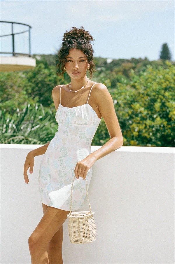 Sometimes less is more! The Silky Vienna Dress is made from a luxurious silky fabric with our exclusive garden print. It is a simple cami style featuring thin straps, gathered bust and body skimming skirt. Style your look with the T Bar Necklace and Transparent Mules! Designed exclusively by Sabo.