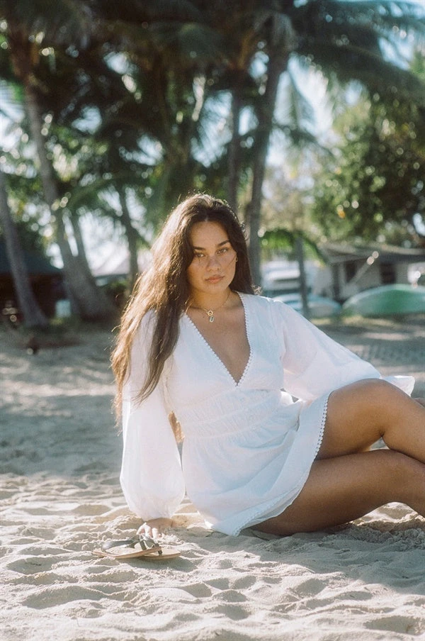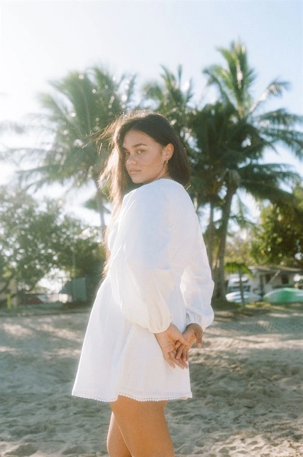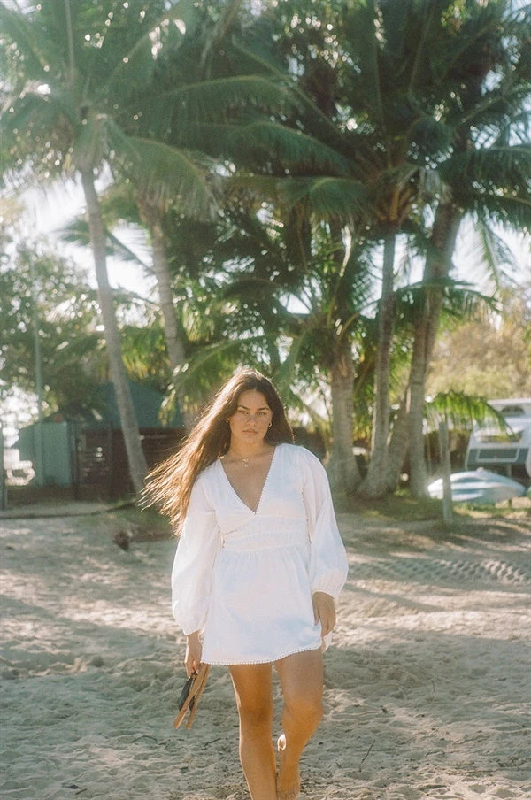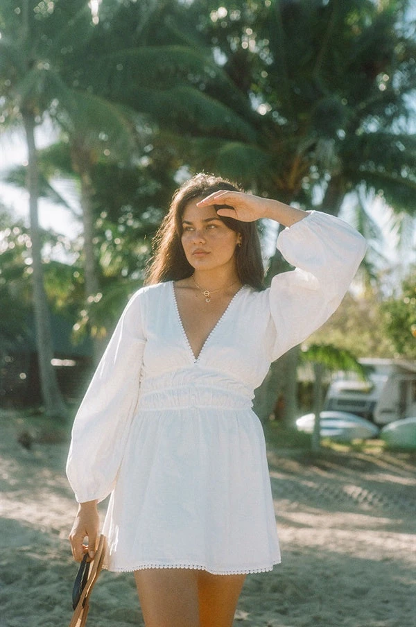Contour your curves with the Skylani Dress, made from a high-quality, natural linen cotton blend fabric in a light cream hue. It features a V neckline, circle trim detailing at neckline and hem, full length puff sleeves, covered button and elastic panel detailing at waist and a flouncy skirt. Add a pop of colour with the green Zita Strappy Sandals and Glow Necklace! Designed exclusively by Sabo.