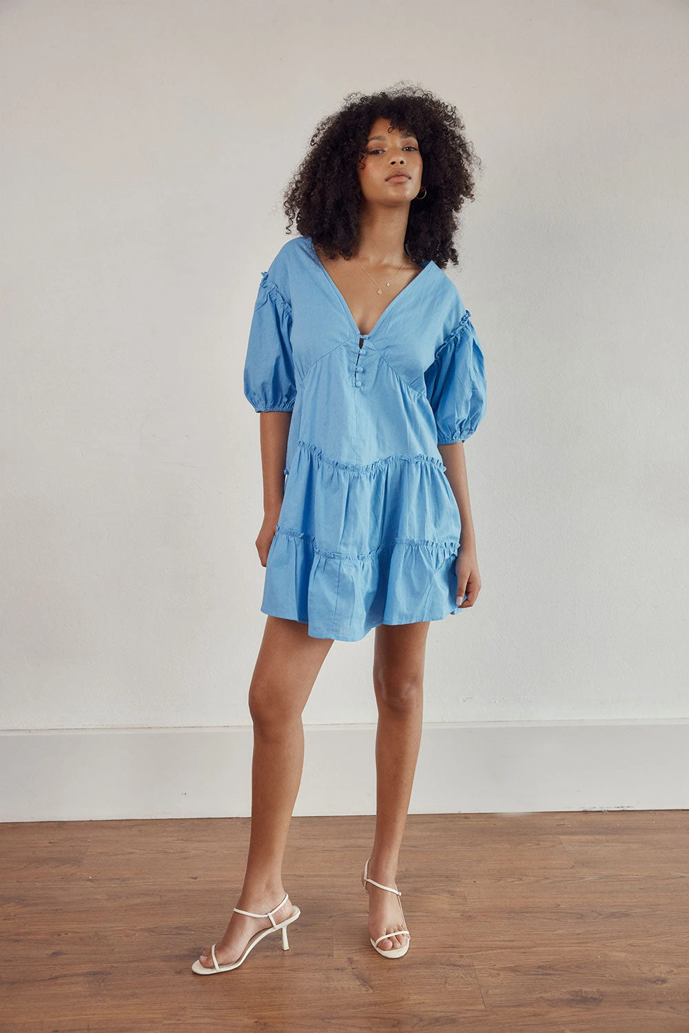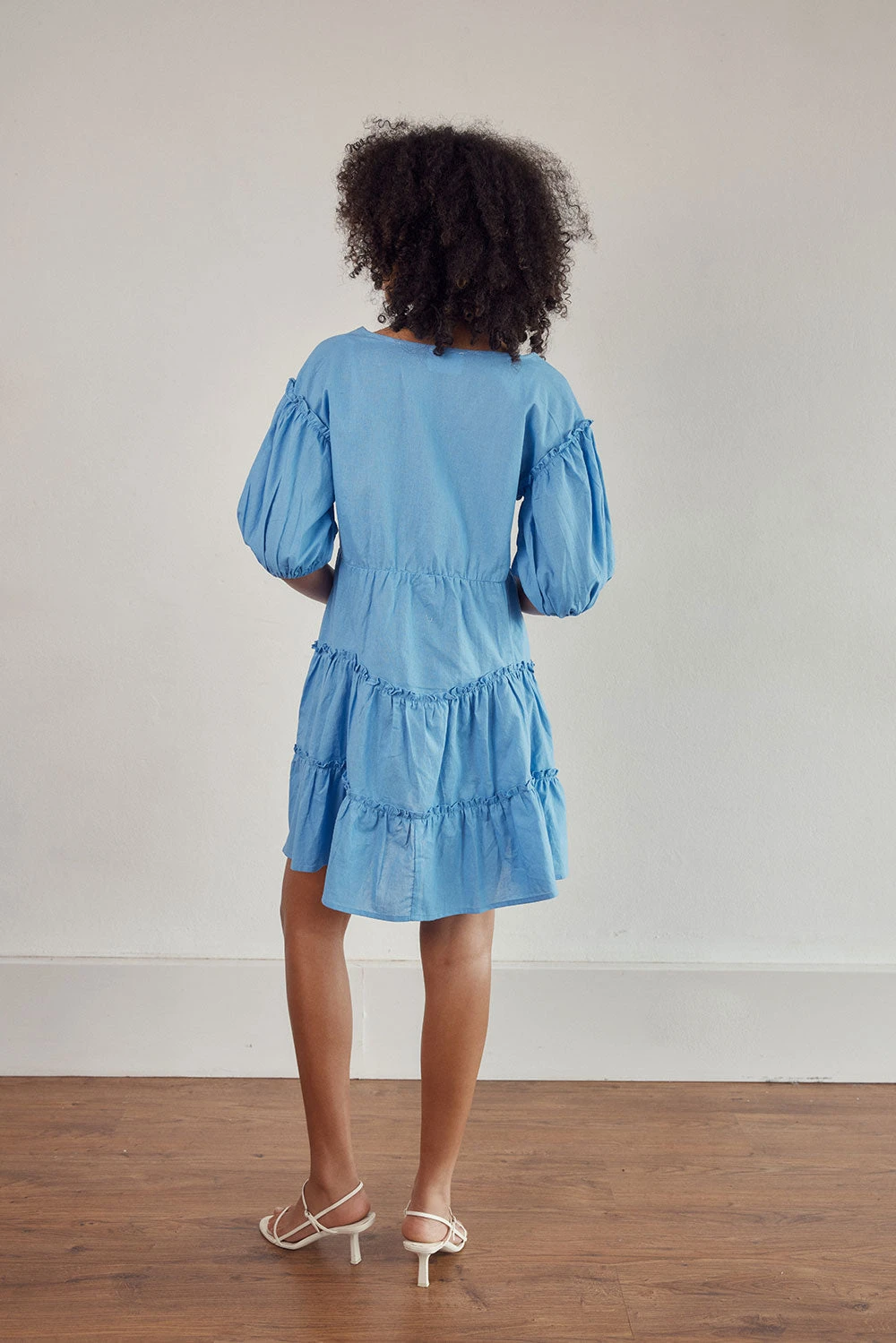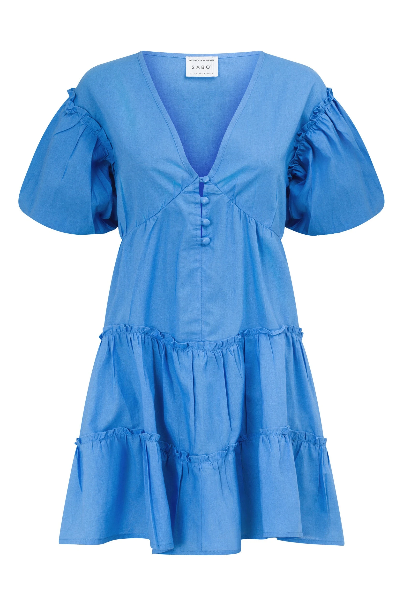 A summer staple! The Tarelle Dress is made from a structured natural cotton fabric in a blue hue. It is a relaxed style featuring a V neckline and covered buttons at waist, short puff sleeves, flouncy tiered skirt with raw exposed ruffle detailing. Complete the look with sandals and Rico Handle Bag! Designed exclusively by Sabo.