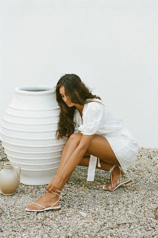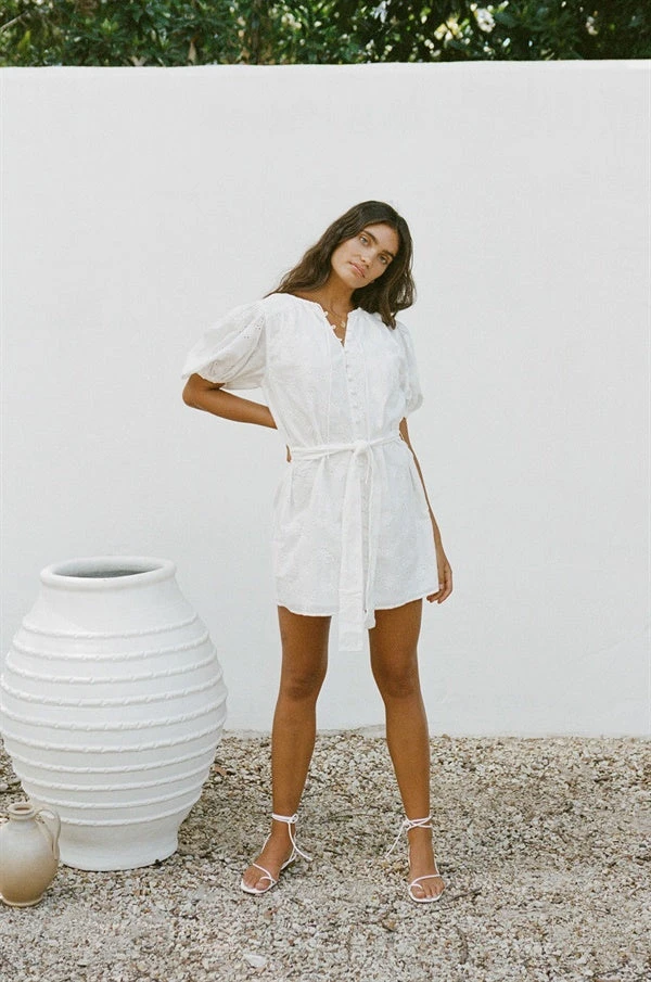 *THIS IS A FINAL SALE ITEM* Made from a stunning natural cotton fabric with eyelet and embroidered detailing, the Vivi Dress features short puff sleeves, covered buttons down centre front, shirred detailing at shoulders and a tie at neckline. Use the matching waist tie to sinch in the waist and pair with the Strappy Eva Heels for your next event! Exclusively designed by Sabo.