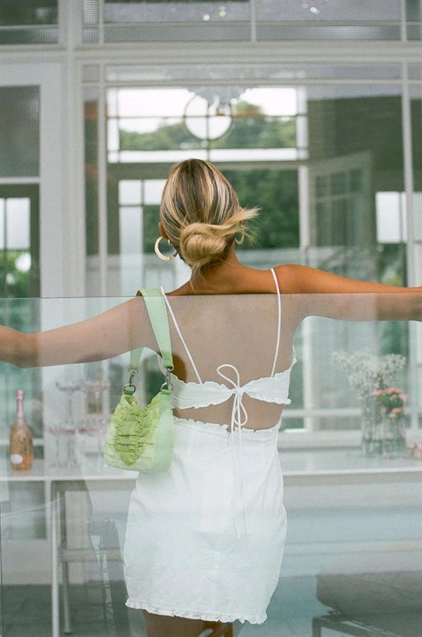 A flattering shape in a simple structured fabric! The Vixen Dress is made from a natural cotton eyelet fabric in white. It features gathered cups, elastic neckline with tie and keyhole cutout at centre bust, ruffle trims throughout and an open back with tie detailing. Complete the look with Jolie Chain Bag and Two Toned Twin Hoops for your next night out! Designed exclusively by Sabo.