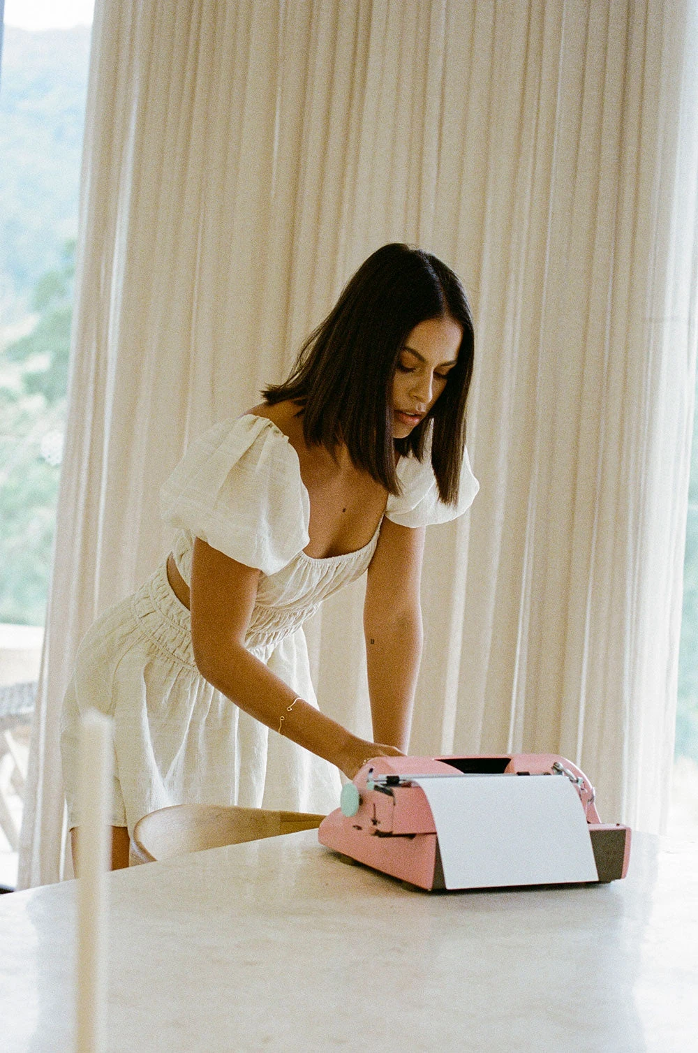 Keep it casual with sandals or dress it up with heels! The Wolfie Dress is made from a lightweight beige fabric with slight stripe detail throughout. It features short puff sleeves, scoop neckline, cutout at waist and elastic detailing across waist. Designed exclusively by Sabo.