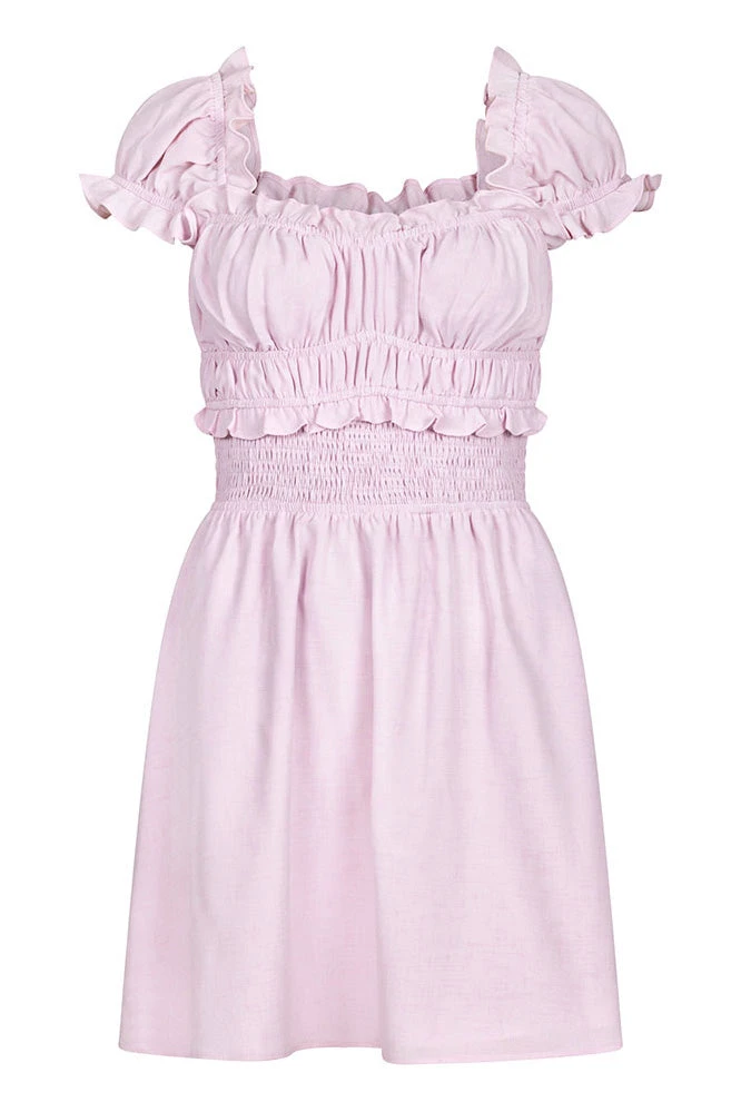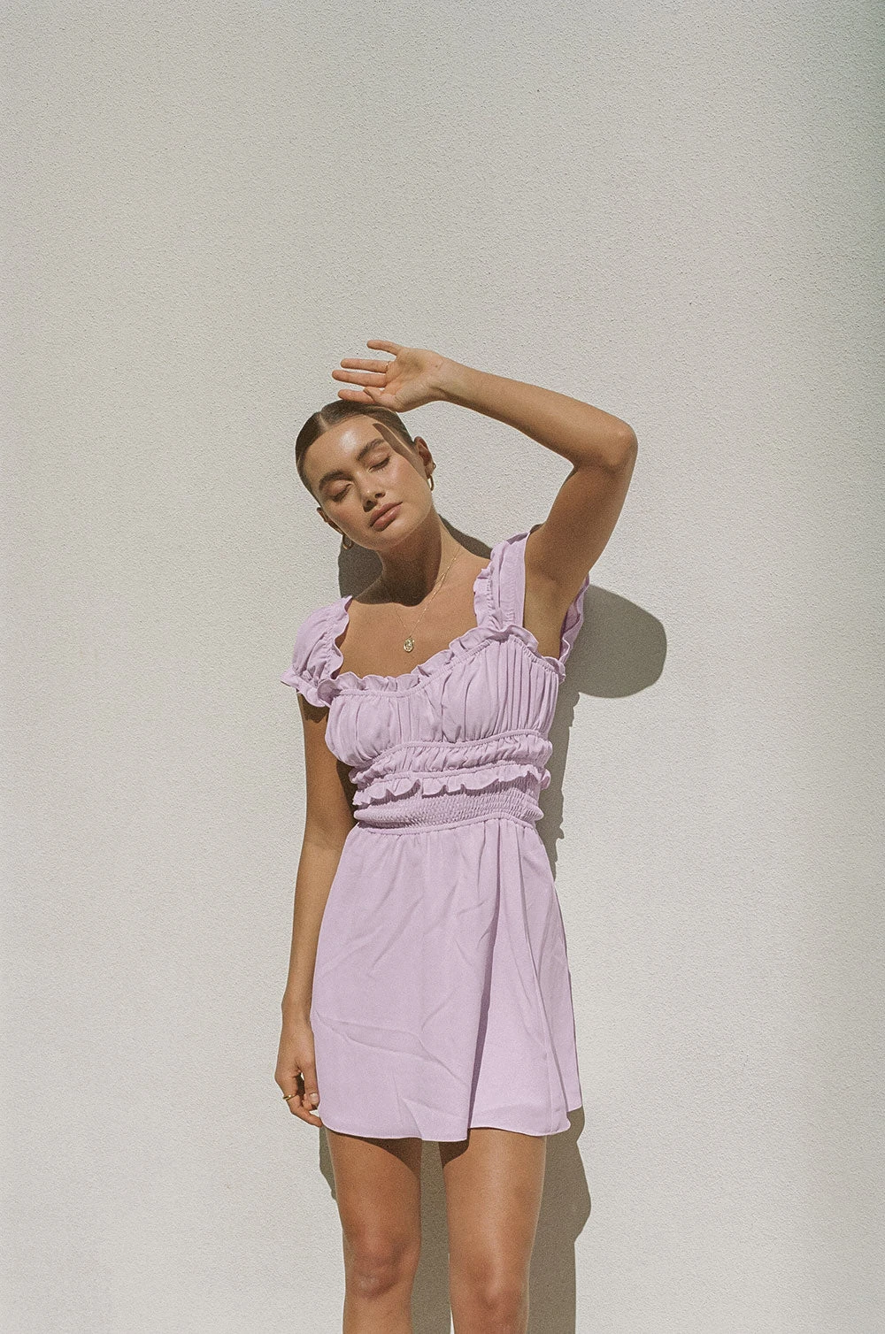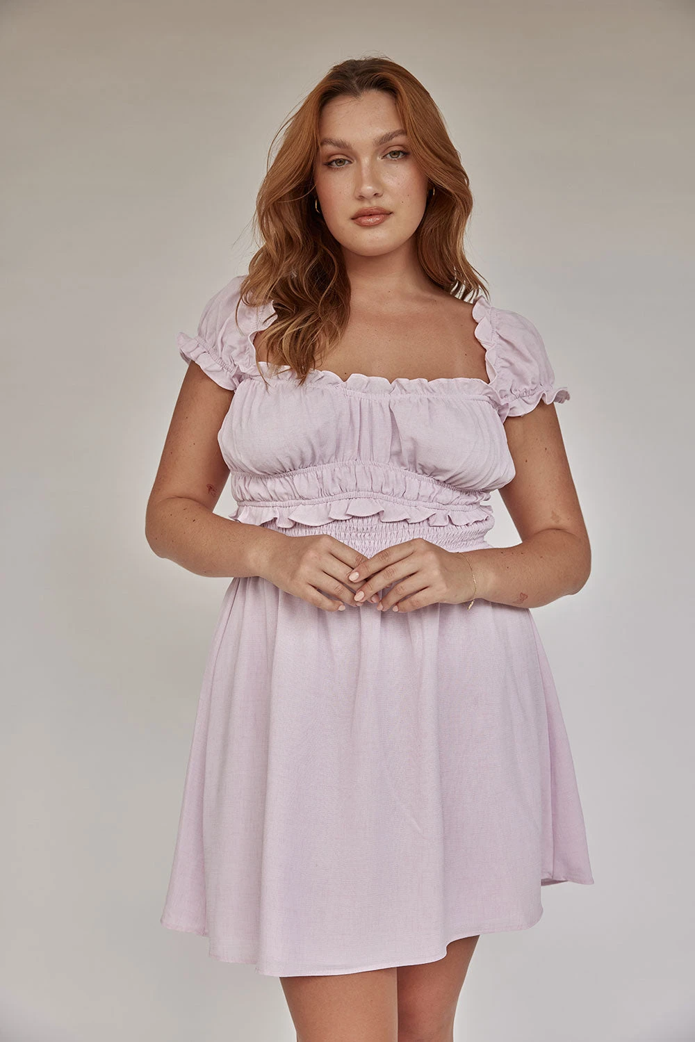 A feminine, easy-to-wear Yulia Dress is made from a stunning lightweight fabric in a soft lilac hue. It features cap sleeves, ruffle details at sleeves, neckline and waist, shirring at waist and a flouncy skirt. Accessorise with 18K Zephyr Drop Huggies and Petal Necklace! Designed exclusively by Sabo.